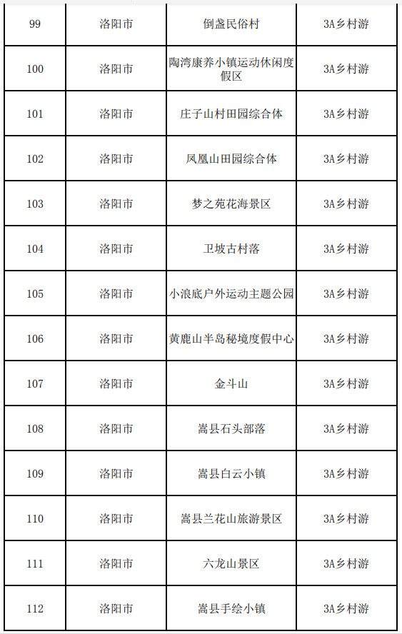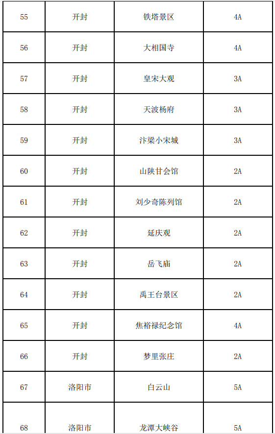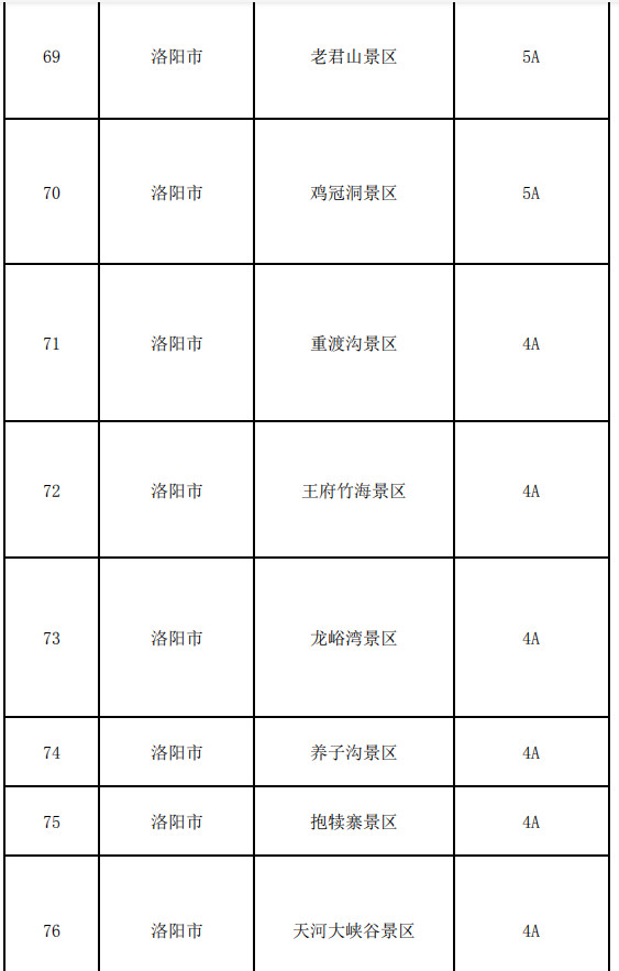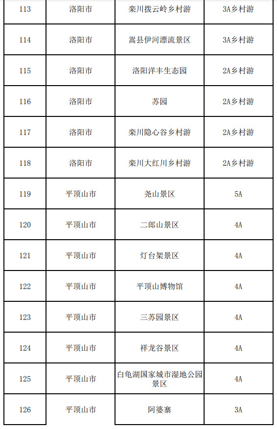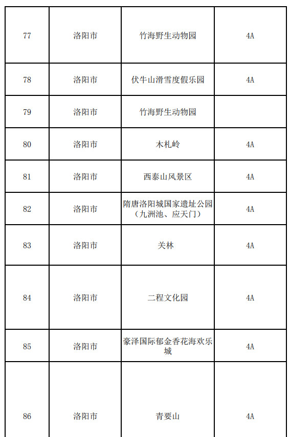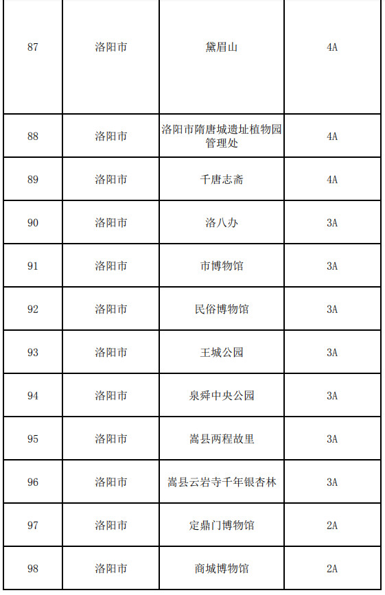 洛陽(yáng)市:龍?zhí)洞髰{谷、老君山景區(qū)、雞冠洞景區(qū)、重渡溝景區(qū)、王府竹海景區(qū)、龍峪灣景區(qū)、養(yǎng)子溝景區(qū)、抱犢寨景區(qū)、天河大峽谷景區(qū)、竹海野生動(dòng)物園、伏牛山滑雪度假樂(lè)園、竹海野生動(dòng)物園、木札嶺、西泰山風(fēng)景區(qū)、隋唐洛陽(yáng)城國(guó)家遺址公園(九洲池、應(yīng)天門)、關(guān)林 、二程文化園、豪澤國(guó)際郁金香花海歡樂(lè)城、青要山、黛眉山洛陽(yáng)市隋唐城遺址植物園管理處、千唐志齋、洛八辦、市博物館、民俗博物館、王城公園、泉舜中央公園、嵩縣兩程故里、嵩縣云巖寺千年銀杏林、定鼎門博物館、商城博物館
