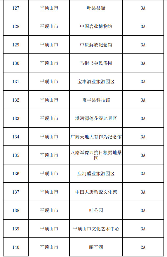 平頂山:堯山景區(qū)、二郎山景區(qū)、燈臺(tái)架景區(qū)、平頂山博物館、三蘇園景區(qū)、祥龍谷景區(qū)、白龜湖國(guó)家城市濕地公園景區(qū)、阿婆寨、葉縣縣衙、中國(guó)巖鹽博物館、中原解放紀(jì)念館、馬街書會(huì)民俗園、寶豐酒業(yè)旅游園區(qū)、寶豐縣科技館、湛河源蓮花濕地景區(qū)、廣闊天地大有作為紀(jì)念館、八路軍豫西抗日根據(jù)地景區(qū)、應(yīng)河醋業(yè)旅游園區(qū)、中國(guó)大唐鈞瓷文化苑、葉公園、平頂山市文化藝術(shù)中心、昭平湖、燕山湖景區(qū)、小何生態(tài)園、燕山趣園、風(fēng)穴寺、九峰山、怪坡、中國(guó)汝瓷小鎮(zhèn)、汝河灣景區(qū)、丹陽(yáng)湖景區(qū)、汝瓷文化園、文廟、華予生態(tài)園