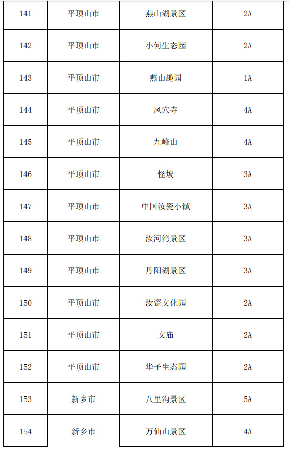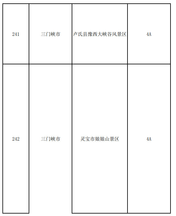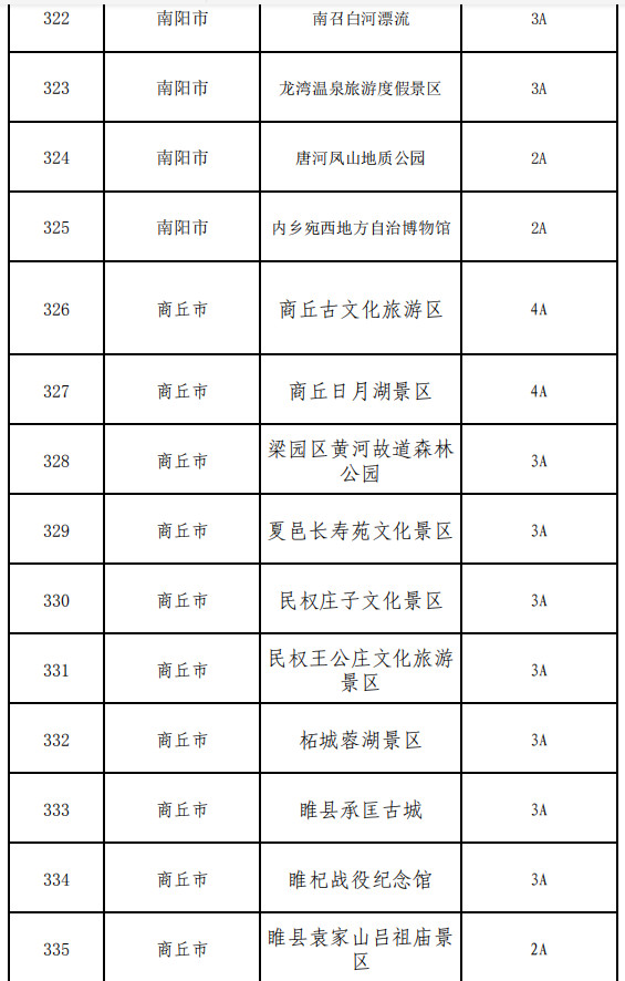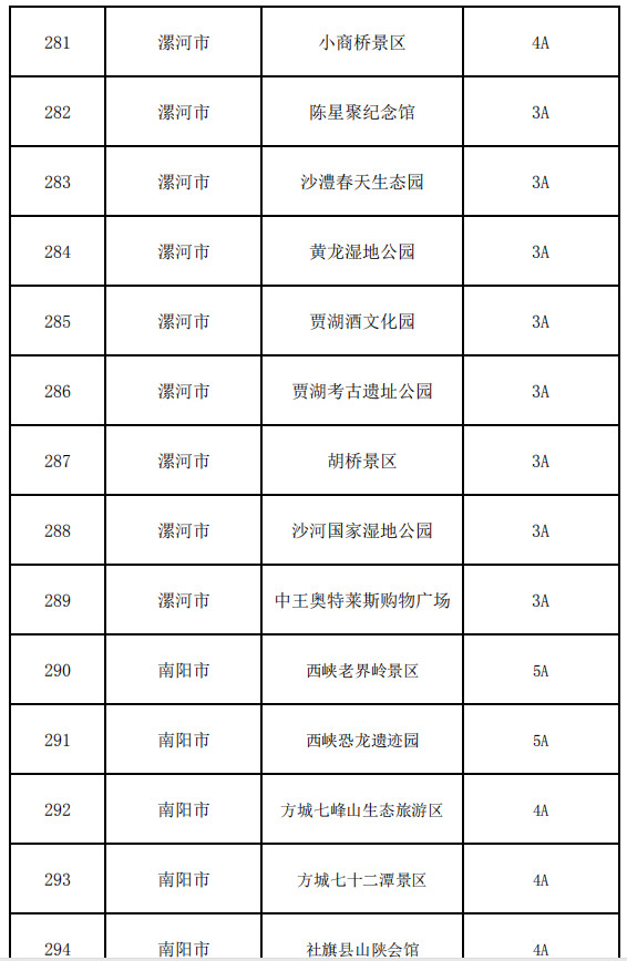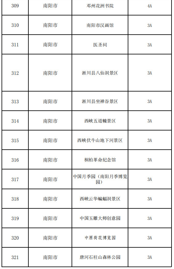 南陽(yáng)市:西峽老界嶺景區(qū)、西峽恐龍遺跡園、方城七峰山生態(tài)旅游區(qū)、方城七十二潭景區(qū)、社旗縣山陜會(huì)館、內(nèi)鄉(xiāng)縣衙、內(nèi)鄉(xiāng)云露山景區(qū)、內(nèi)鄉(xiāng)中原二龍山景區(qū)、內(nèi)鄉(xiāng)寶天曼景區(qū)、桐柏山淮源風(fēng)景區(qū)、南陽(yáng)五朵山景區(qū)、南召寶天曼、淅川縣香嚴(yán)寺景區(qū)、西峽龍?zhí)稖暇皡^(qū)、西峽老君洞、西峽寺山國(guó)家森林公園、西峽鸛河漂流風(fēng)景區(qū)、鎮(zhèn)平國(guó)際玉城、鄧州花洲書院、南陽(yáng)市漢畫館、醫(yī)圣祠、淅川縣八仙洞景區(qū)、淅川縣坐禪谷景區(qū)、西峽五道幢景區(qū)、西峽伏牛山地下河景區(qū)、桐柏革命紀(jì)念館、中國(guó)月季園(南陽(yáng)月季博覽園)、西峽云華蝙蝠洞景區(qū)、中國(guó)玉雕大師創(chuàng)意園、中原荷花博覽園、唐河石柱山森林公園、南召白河漂流、龍灣溫泉旅游度假景區(qū)、唐河鳳山地質(zhì)公園、內(nèi)鄉(xiāng)宛西地方自治博物館