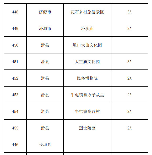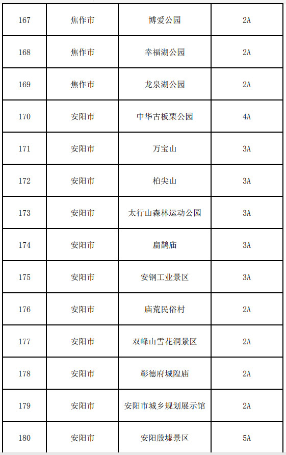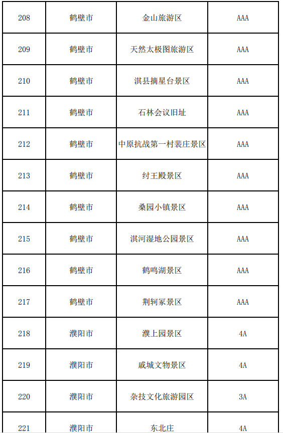 鶴壁市:云夢(mèng)山景區(qū)、古靈山景區(qū)、朝陽(yáng)山景區(qū)、大伾山風(fēng)景名勝區(qū)、五巖山旅游區(qū)、朝歌文化園、?h古城、金山旅游區(qū)、天然太極圖旅游區(qū)、淇縣摘星臺(tái)景區(qū)、石林會(huì)議舊址、中原抗戰(zhàn)第一村裴莊景區(qū)、紂王殿景區(qū)、桑園小鎮(zhèn)景區(qū)、淇河濕地公園景區(qū)、鶴鳴湖景區(qū)、荊軻冢景區(qū)