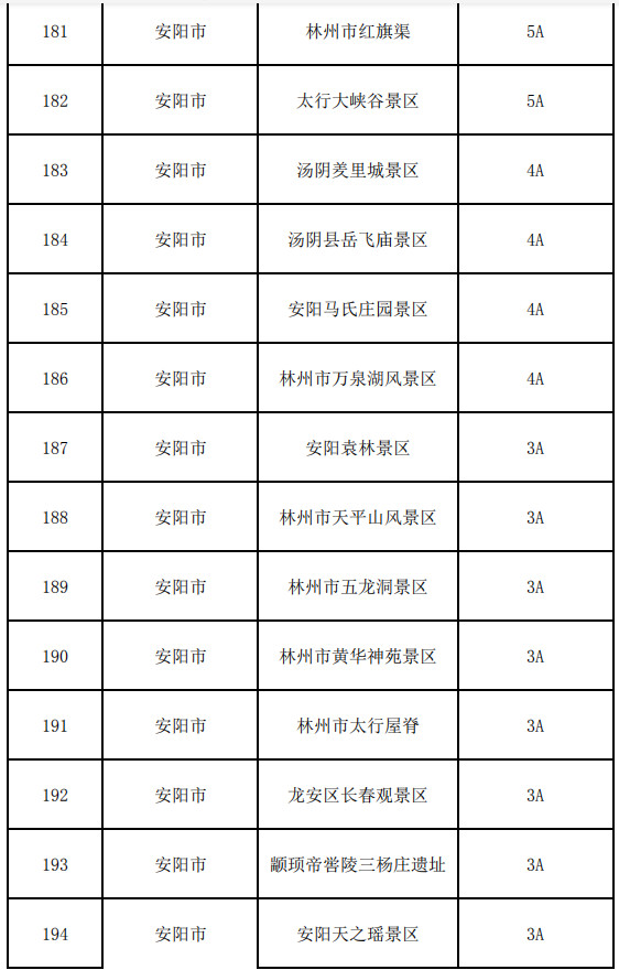 安陽(yáng)市:中華古板栗公園、萬(wàn)寶山、柏尖山、太行山森林運(yùn)動(dòng)公園、扁鵲廟、安鋼工業(yè)景區(qū)、廟荒民俗村、雙峰山雪花洞景區(qū)、彰德府城隍廟、安陽(yáng)市城鄉(xiāng)規(guī)劃展示館、安陽(yáng)殷墟景區(qū)、林州市紅旗渠、太行大峽谷景區(qū)、湯陰羑里城景區(qū)、湯陰縣岳飛廟景區(qū)、安陽(yáng)馬氏莊園景區(qū)、林州市萬(wàn)泉湖風(fēng)景區(qū)、安陽(yáng)袁林景區(qū)、林州市天平山風(fēng)景區(qū)、林州市五龍洞景區(qū)、林州市黃華神苑景區(qū)、林州市太行屋脊、龍安區(qū)長(zhǎng)春觀景區(qū)、內(nèi)黃縣顓頊帝嚳陵·三楊莊遺址景區(qū)、安陽(yáng)天之瑤景區(qū)、林州市洪谷山景區(qū)、龍安區(qū)洹水古寨景區(qū)、中國(guó)安陽(yáng)蠟梅園景區(qū)、龍安區(qū)洹河峽谷風(fēng)景區(qū)、安陽(yáng)天寧寺旅游景區(qū)、安陽(yáng)縣都里漳河灣旅游區(qū)