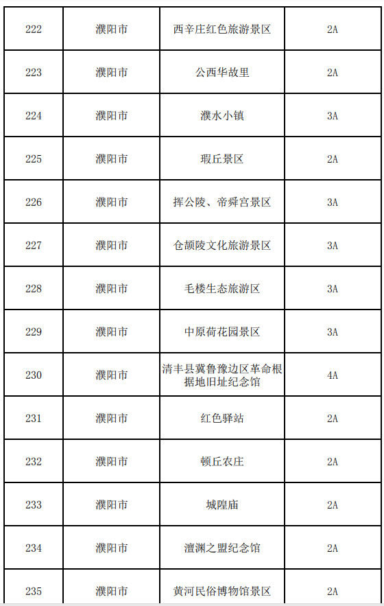 濮陽(yáng)市:濮上園景區(qū)、戚城文物景區(qū)、雜技文化旅游園區(qū)、東北莊、西辛莊紅色旅游景區(qū)、公西華故里、濮水小鎮(zhèn)、瑕丘景區(qū)、揮公陵、帝舜宮景區(qū)、倉(cāng)頡陵文化旅游景區(qū)、毛樓生態(tài)旅游區(qū)、中原荷花園景區(qū)、清豐縣冀魯豫邊區(qū)革命根據(jù)地舊址紀(jì)念館、紅色驛站、頓丘農(nóng)莊、城隍廟、澶淵之盟紀(jì)念館、黃河民俗博物館景區(qū)