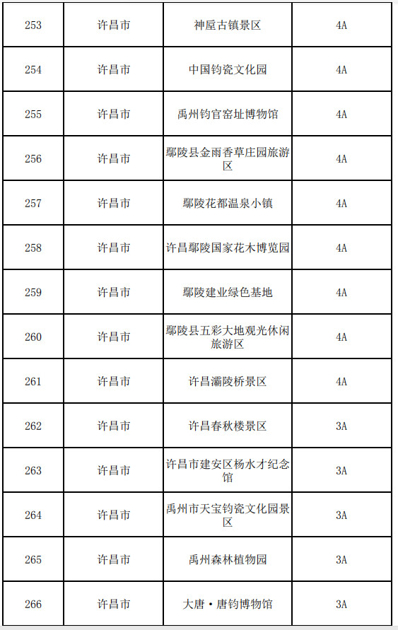 許昌市:神垕古鎮(zhèn)景區(qū)、中國(guó)鈞瓷文化園、禹州鈞官窯址博物館、鄢陵縣金雨香草莊園旅游區(qū)、鄢陵花都溫泉小鎮(zhèn)、許昌鄢陵國(guó)家花木博覽園、鄢陵建業(yè)綠色基地、鄢陵縣五彩大地觀光休閑旅游區(qū)、許昌灞陵橋景區(qū)、許昌春秋樓景區(qū)、許昌市建安區(qū)楊水才紀(jì)念館、禹州市天寶鈞瓷文化園景區(qū)、禹州森林植物園、大唐·唐鈞博物館、鄢陵唐韻櫻花園、毛主席視察紀(jì)念館、襄城縣紫云雷洞景區(qū)、禹州市張家莊紅河谷景區(qū)、禹州市盛田百年粉坊景區(qū)、禹州市金鼎鈞窯景區(qū)、禹州宣和陶瓷博物館、坪山鈞窯、毛主席紀(jì)念館、紫云山風(fēng)景區(qū)、大鴻寨景區(qū)