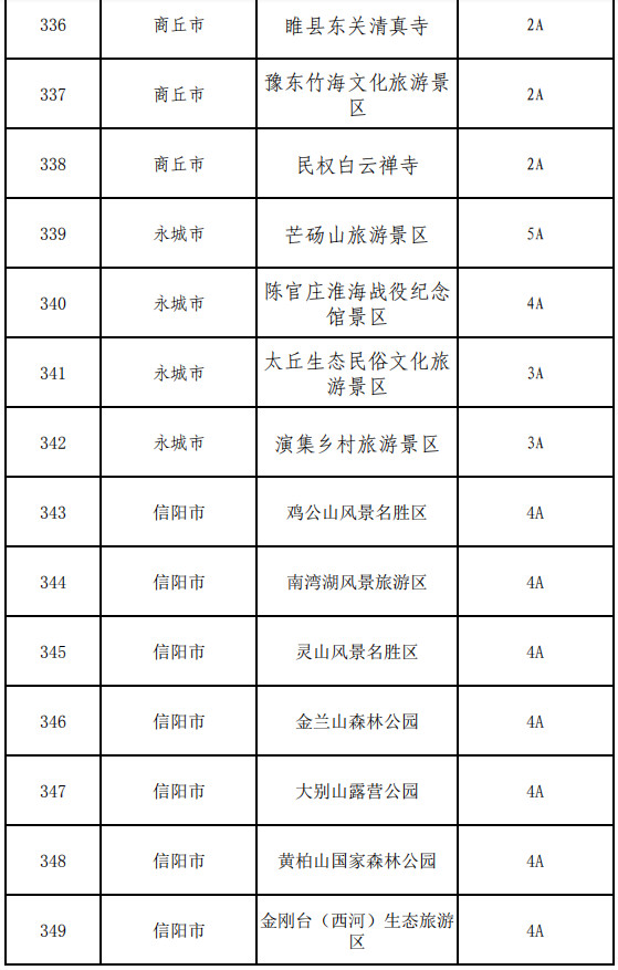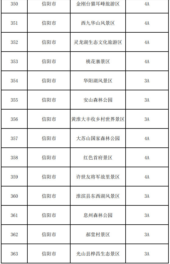 信陽(yáng)市:雞公山風(fēng)景名勝區(qū)、南灣湖風(fēng)景旅游區(qū)、靈山風(fēng)景名勝區(qū)、金蘭山森林公園、大別山露營(yíng)公園、黃柏山國(guó)家森林公園、金剛臺(tái)(西河)生態(tài)旅游區(qū)、金剛臺(tái)貓耳峰旅游區(qū)、西九華山風(fēng)景區(qū)、靈龍湖生態(tài)文化旅游區(qū)、桃花寨景區(qū)、華陽(yáng)湖風(fēng)景區(qū)、安山森林公園、黃淮大豐收鄉(xiāng)村世界景區(qū)、大蘇山國(guó)家森林公園、紅色首府景區(qū)、許世友將軍故里景區(qū)、淮濱縣東西湖風(fēng)景區(qū)、息州森林公園、郝堂村景區(qū)、光山縣樺昌生態(tài)景區(qū)、西河古村落、田鋪大塆、綠康源風(fēng)景區(qū)、大別山古樹博物園、大別山紅廉文化園、丁李灣風(fēng)景區(qū)、新縣奇龍嶺景區(qū)、七龍山江寨景區(qū)、豬山圈生態(tài)旅游景區(qū)、九架嶺生態(tài)旅游景區(qū)、武占嶺生態(tài)旅游度假區(qū)、濮公山礦山公園、信陽(yáng)五曲峽森林公園、信陽(yáng)文新茶村、信陽(yáng)書畫院生態(tài)文化旅游區(qū)、湯泉池風(fēng)景區(qū)、鄭維山將軍故里景區(qū)、鄂豫皖革命紀(jì)念館、黃國(guó)古城文化旅游區(qū)、紅二十五軍長(zhǎng)征出發(fā)地何家沖紀(jì)念園、劉鄧大軍渡淮紀(jì)念館、鄧穎超祖居紀(jì)念館、王大灣會(huì)議會(huì)址紀(jì)念館、陳元光祖祠景區(qū)