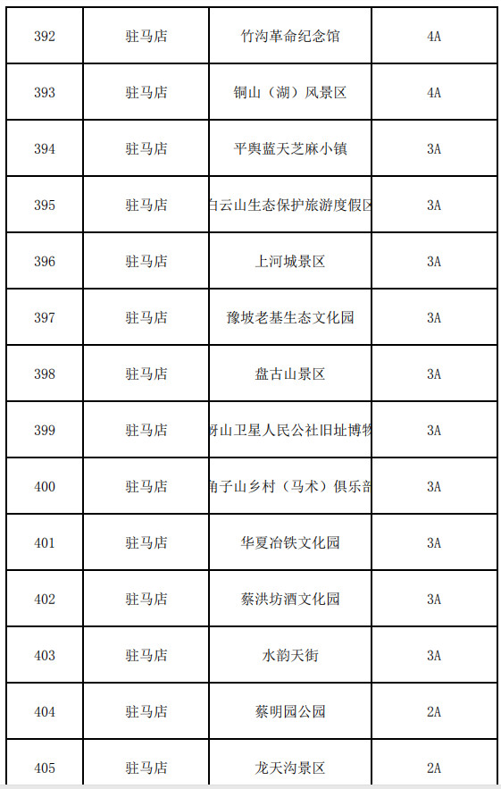 駐馬店市:嵖岈山旅游景區(qū)、老樂(lè)山景區(qū)、金頂山景區(qū)、竹溝革命紀(jì)念館、銅山(湖)風(fēng)景區(qū)、泌陽(yáng)縣白云山生態(tài)保護(hù)旅游度假區(qū)、上河城景區(qū)、豫坡老基生態(tài)文化園 、鄂豫邊革命紀(jì)念館、盤古山景區(qū)、嵖岈山衛(wèi)星人民公社舊址博物館、確山縣臨時(shí)治安委員會(huì)紀(jì)念館、角子山鄉(xiāng)村(馬術(shù))俱樂(lè)部、藍(lán)天芝麻小鎮(zhèn)、留莊稻田公園、華夏冶鐵文化園、竹溝革命烈士陵園、水韻天街 、蔡洪坊酒文化園、蔡明園公園、龍?zhí)鞙暇皡^(qū)、南海公園、太極山莊、古佛文化園、和園景區(qū)、嫘祖花苑、古泉山莊生態(tài)農(nóng)業(yè)觀光園、文廟、月亮灣公園、南海禪寺景區(qū)