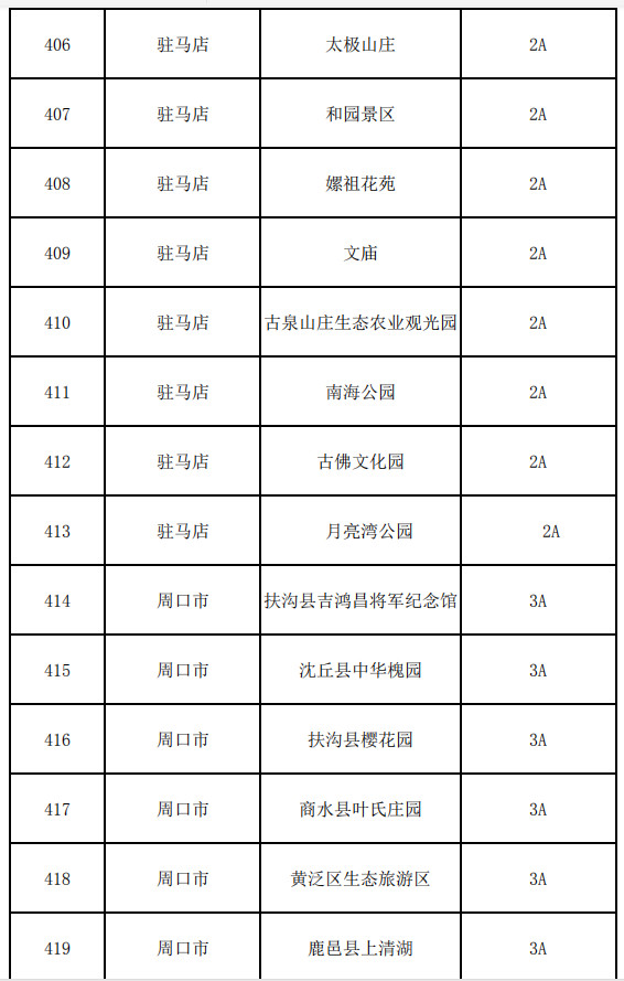 周口市:扶溝縣吉鴻昌將軍紀(jì)念館、沈丘縣中華槐園、扶溝縣櫻花園、商水縣葉氏莊園、黃泛區(qū)生態(tài)旅游區(qū)、鹿邑縣上清湖、川匯區(qū)生態(tài)游樂(lè)園、鄲城縣中原民俗園、周口華威民俗文化博物苑、淮陽(yáng)平糧臺(tái)、淮陽(yáng)太虛觀、淮陽(yáng)陳胡公陵淮陽(yáng)陳風(fēng)文化園、太康縣謝氏文化園、太康縣萬(wàn)鶴賚·天寧購(gòu)物公園、西華縣杜崗會(huì)師紀(jì)念館、鹿邑縣閆溝河、鹿邑縣武平城、周口關(guān)帝廟、淮陽(yáng)太昊陵、鹿邑縣老子故里旅游區(qū)、淮陽(yáng)弦歌臺(tái)、項(xiàng)城市袁寨古民居(含水寨袁宅)、西華縣女媧城、淮陽(yáng)獨(dú)秀園、鹿邑縣老子歷史博物館、淮陽(yáng)畫卦臺(tái)、項(xiàng)城市南頓故城