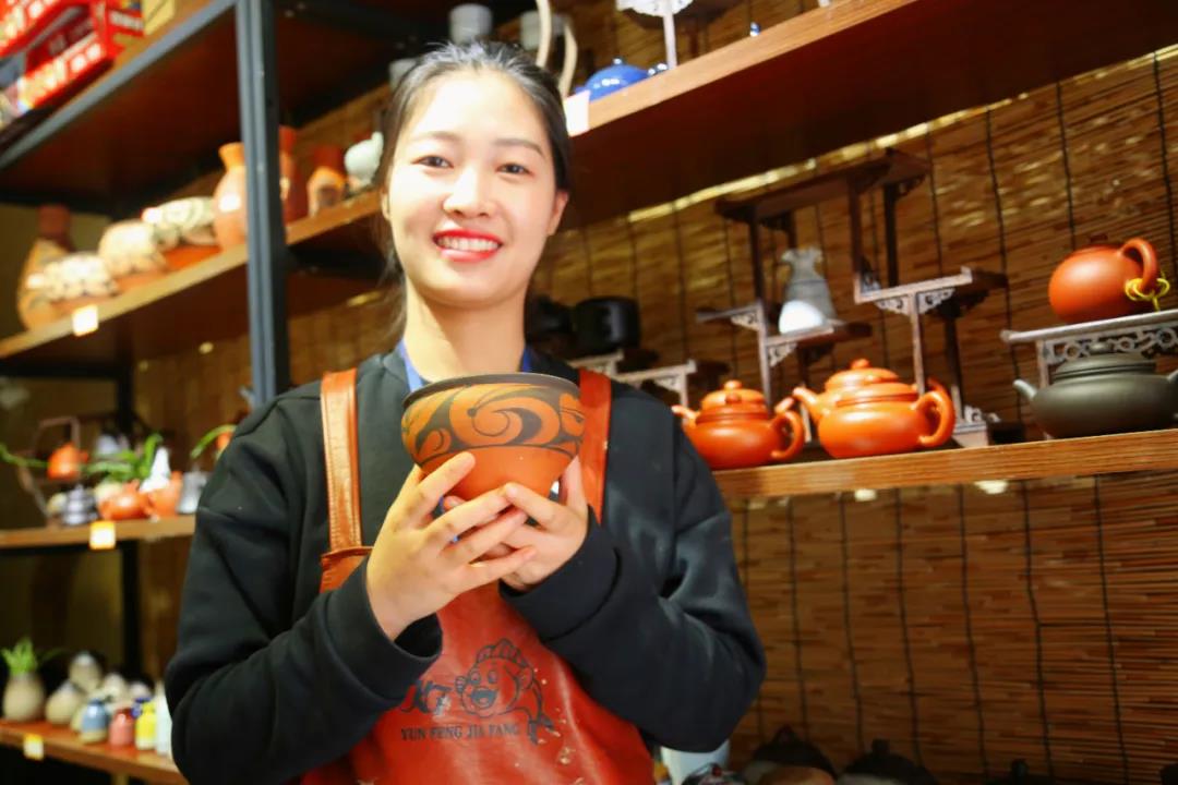 2016年,陜州地坑院景區(qū)開(kāi)園,她便積極響應(yīng)景區(qū)的非遺號(hào)召,帶著陜州窯入駐在9號(hào)院,風(fēng)雨無(wú)阻地堅(jiān)守著寶貝陶瓷,現(xiàn)場(chǎng)教授游客,制陶體驗(yàn)感極佳,頗受好評(píng)。