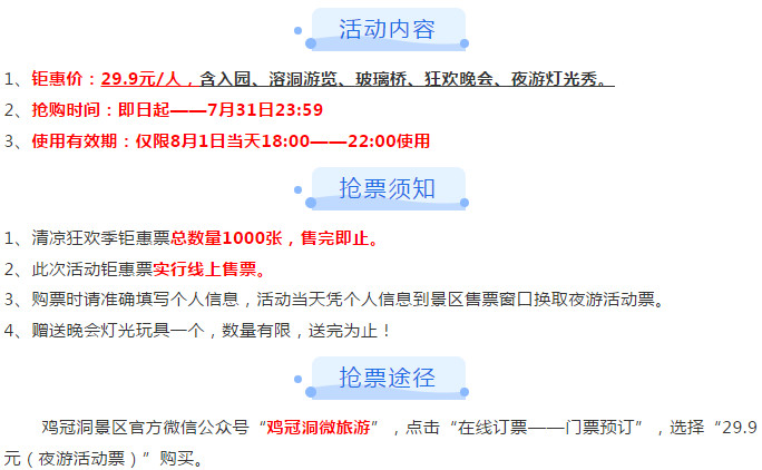 為回饋廣大游客朋友的厚愛與支持,雞冠洞景區(qū)特推出清涼狂歡季鉅惠票搶購活動!