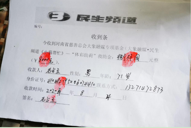 毛占立在50歲的時(shí)候才喜得兒子,他為兒子取名“緣修”。緣修去年考上了信陽師范學(xué)院,為了不耽誤兒子上大學(xué),他貸款8000元為兒子交學(xué)費(fèi),在親戚和朋友的幫助下,湊齊了兒子的學(xué)費(fèi)和生活費(fèi),爭氣的緣修品學(xué)兼優(yōu),獲得學(xué)校的一等獎學(xué)金資助,為家庭緩解了經(jīng)濟(jì)壓力。今年放暑假后,就到江蘇常熟快遞公司打工,為自己賺取生活費(fèi)。民生頻道《小莉幫忙》—“體彩助莉”為其捐助救8000元,解決了兒子的學(xué)費(fèi),接到救助金的那一刻毛占立流下了感激的淚水。