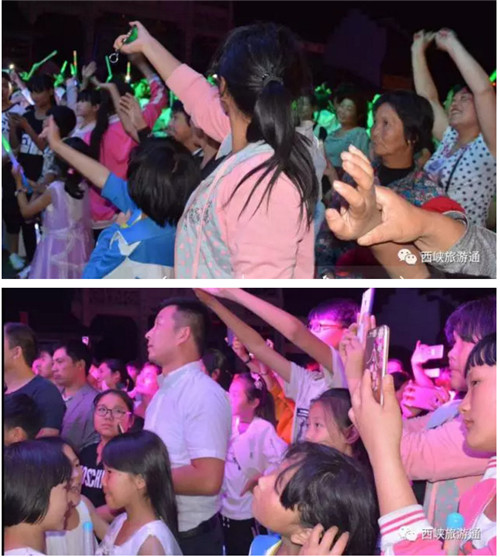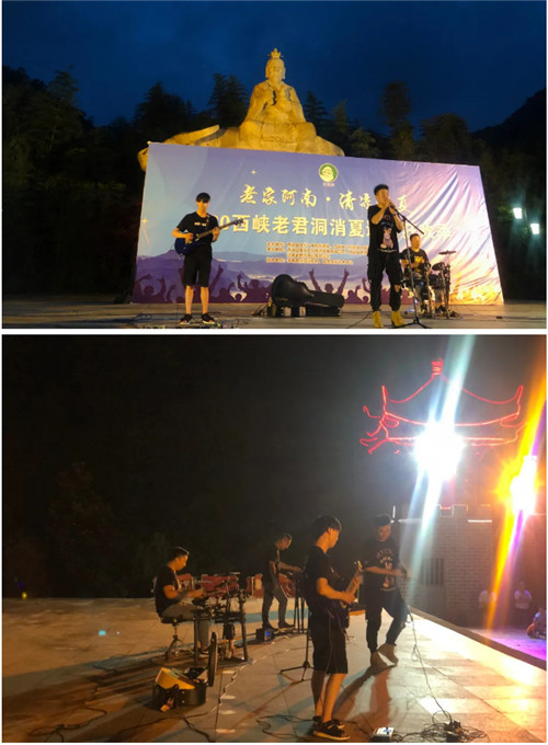 晚上七點三十分左右,音樂晚會激情上演,精彩的歌曲引來了全場一陣陣尖叫,清亮高亢的電音舞曲,優(yōu)雅大氣的民謠歌曲,燃爆了老君洞之夜!