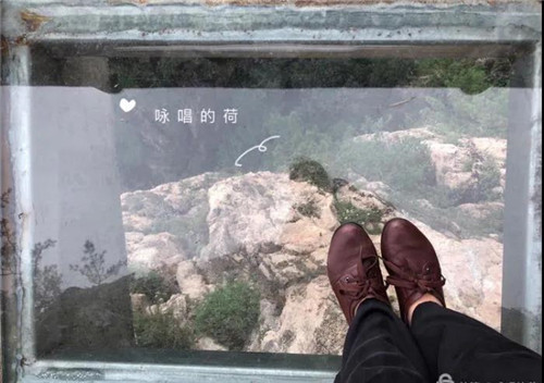 玻璃觀景天臺是用幾十塊一米見方的玻璃拼接而成,并伸出懸崖外。透過玻璃,山崖下的溝壑樹木清晰可見,很多人不敢站在上面,即便勉強(qiáng)站在上面了,也不敢向前邁進(jìn)一步。