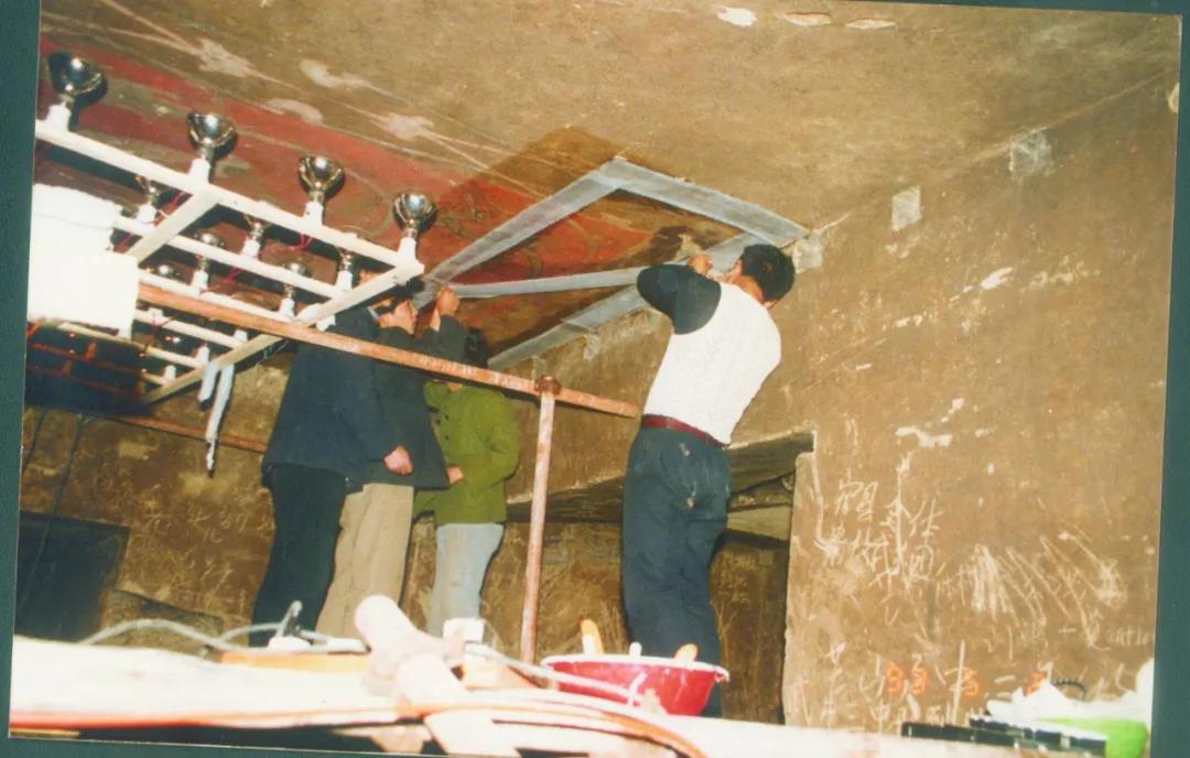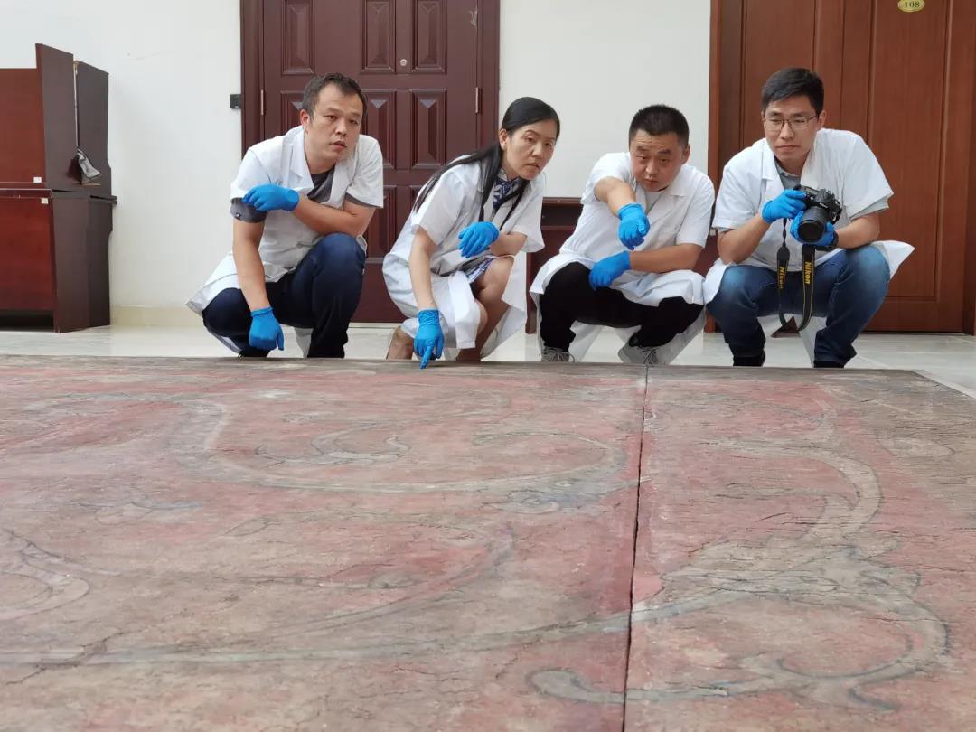 1991年5月,由中央美術學院美術史系湯池教授帶領團隊對壁畫進行臨摹。1992年7月,河南古代建筑保護研究所研究員陳進良等專家根據(jù)壁畫保存現(xiàn)狀及畫面布局,經(jīng)研究決定把壁畫分成五塊進行分割揭取。《四神云氣圖》揭取復原后的壁畫本體1994年移交河南省博物館,1998年河南博物院新館建成,《四神云氣圖》被河南博物院永久收藏,列為“九大鎮(zhèn)院之寶”之一。