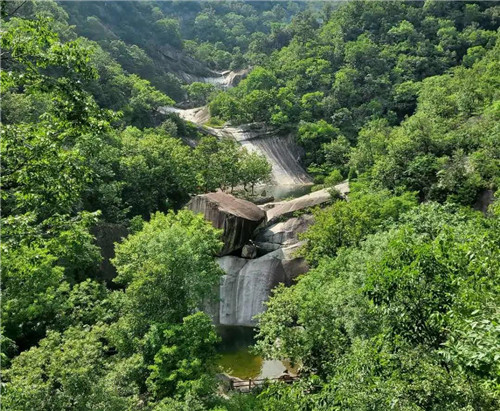 龍?zhí)稖暇皡^(qū)自然落差近千米,整個(gè)山體猶如兩條巨龍盤(pán)踞,分別顯現(xiàn)龍首、龍口、龍角和龍身,兩山相夾的峽谷自下而上形成梯式瀑布共19個(gè),大小潭穴72處,一瀑一潭景色壯觀,落差最高的瀑布約35米 ,最低的也有15米,最為著名的“四連瀑”四瀑相連,逶迤蛇行,夏秋旺水季節(jié),峽谷內(nèi)銀練直掛,碧花橫飛,云蒸霞蔚,令人叫絕。