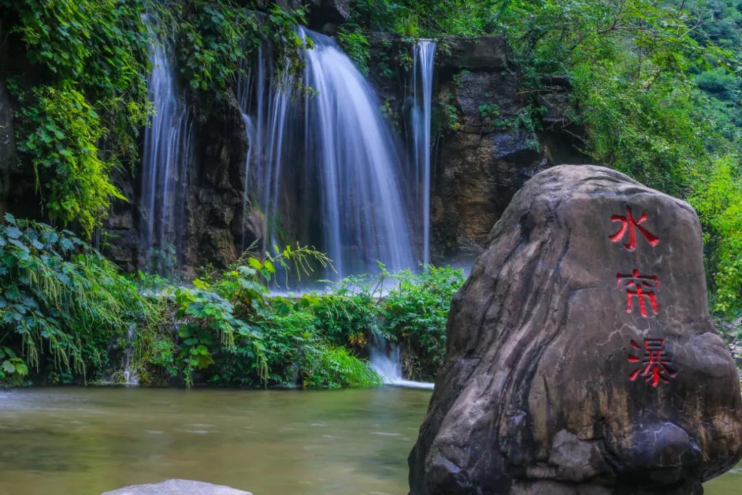 潭瀑峽中三步一泉、五步一瀑宛若江南,聽流水汩汩叮咚作響,觀群瀑爭流好似濺玉,清澈的溪水順著山石而下,若潔白無瑕的素絹,溫柔的流淌在山間。