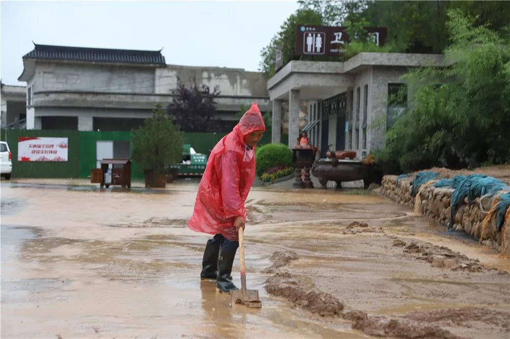 迅速出動、冒雨清理泥土,奮力營造整潔舒適的游覽環(huán)境。