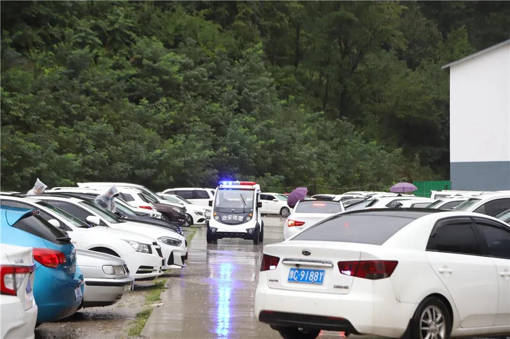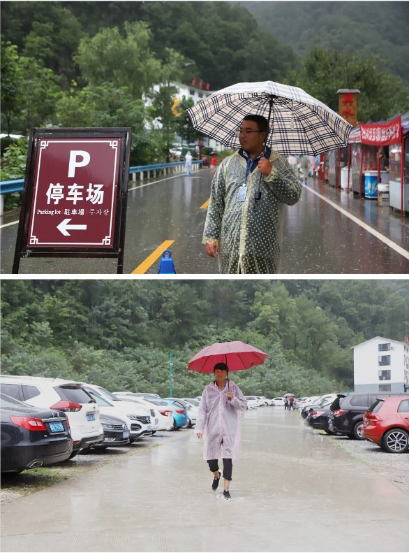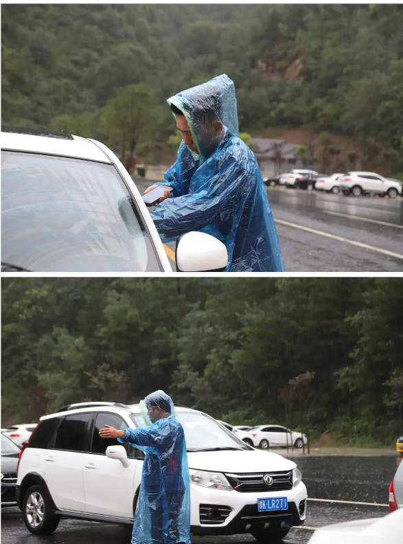 鞋子、褲子早已被雨水打濕,但阻擋不了他們前行的腳步,他們提醒并檢查每一臺入場車輛的車燈、車門、車窗是否關(guān)閉。他們是穿梭在停車場的衛(wèi)士,更是游客財產(chǎn)安全的守護者。