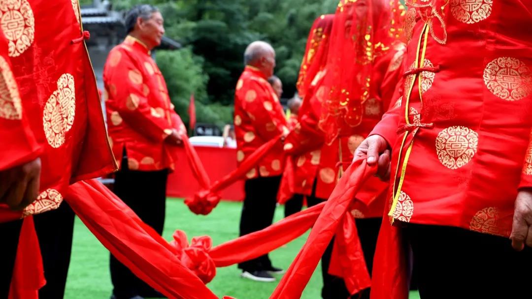 龍飛鳳舞結(jié)良辰,夫妻對拜喜盈門。中式慶典現(xiàn)場,老人為老伴蓋上紅蓋頭,金婚老人相對而立,相互對拜。