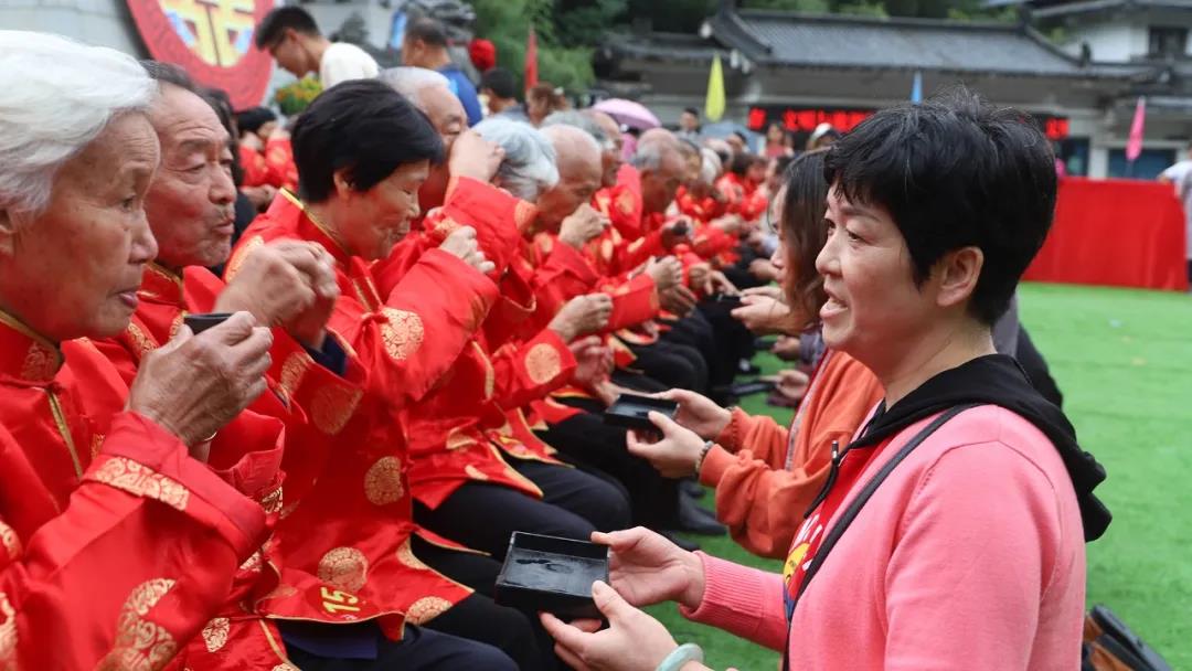 子女后輩向老人們敬茶獻(xiàn)花束,獻(xiàn)上晚輩對長輩的敬愛之心。