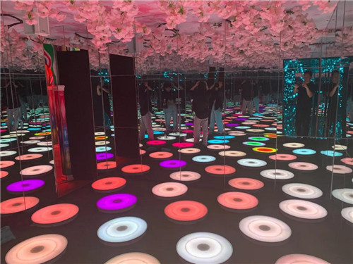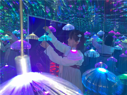 變幻的五色燈光,巧妙布置的平面鏡,折射出無數(shù)個(gè)圓柱形水母,交織成一片星空海洋。