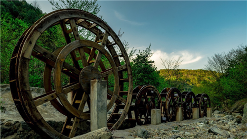 初進谷的時候,在步階的兩側(cè)佇立著幾個古色古香的水車。