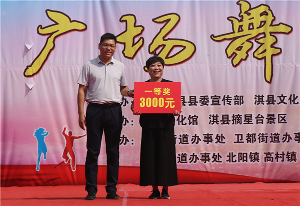 淇縣縣委宣傳部副部長張國慶為城區(qū)組一等獎舞隊頒獎