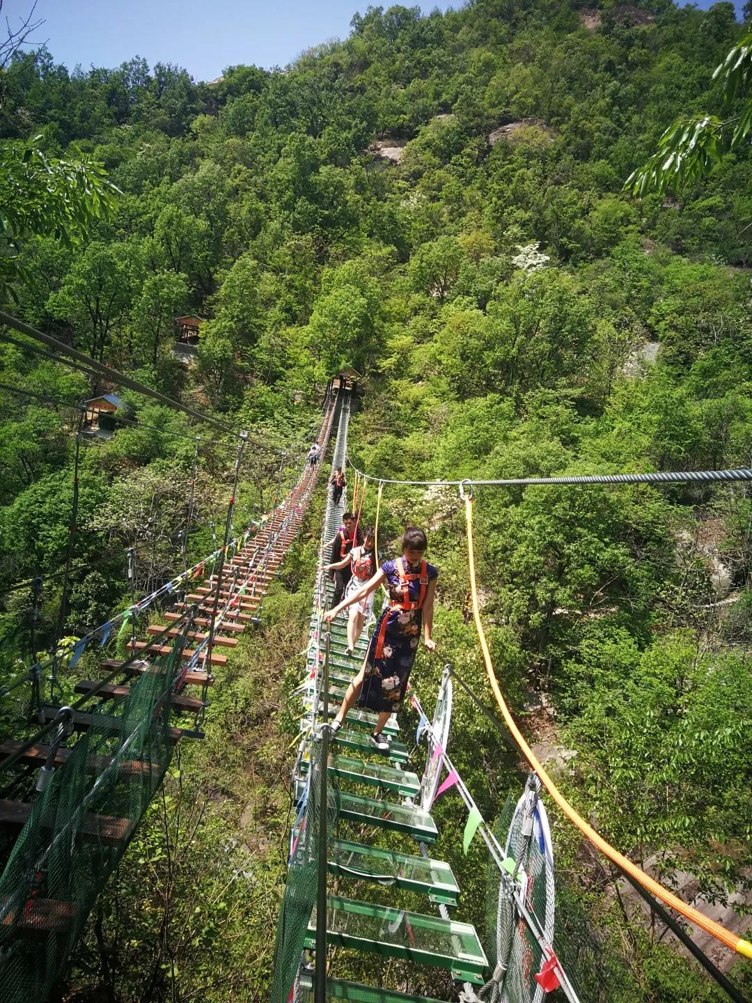 龍?zhí)稖暇W(wǎng)紅探險(xiǎn)橋位于九龍圣母潭上方,橋的入口位于景區(qū)內(nèi)最精華景點(diǎn)——四連瀑布觀景臺(tái)處,探險(xiǎn)橋全長118米,離地100多米,由玻璃探險(xiǎn)橋和鐵鎖鏈探險(xiǎn)橋兩部分組成。置身于探險(xiǎn)橋上,向前可欣賞到秀美壯觀的四連瀑布,向下可以俯瞰到龍?zhí)稖系奶镀傧噙B,曲徑通幽,可謂美不勝收!
