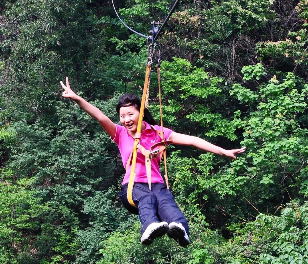 腳踏白云,映襯著藍(lán)天,讓步青山、峽谷、瀑布、山巒在身下一晃而過,驚恐中,非常平安地從這個(gè)山頭到達(dá)那個(gè)山頭。凡有過這種體驗(yàn)的游客,都說玩龍?zhí)稖系?ldquo;空中滑索”,就是爽!