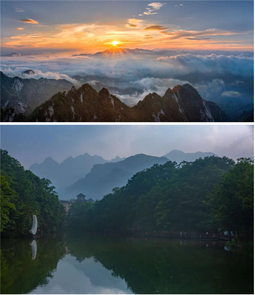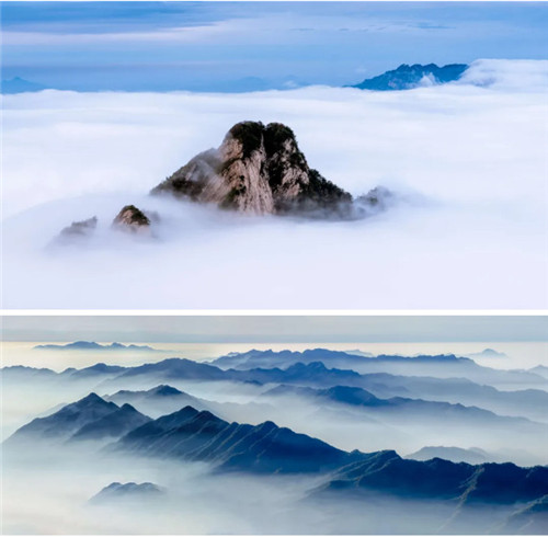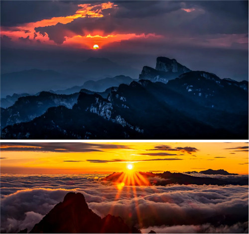 太陽尚在地平線之下,翻涌舒卷的云海在山峰起舞,破曉前的一道曙光劃破了沉靛藍(lán)的天空。橙紅的日光從云霧中冒頭,如水銀泄地般,無孔不入,不到一刻鐘就已遍布天際、山峰。