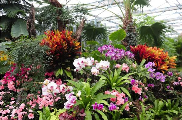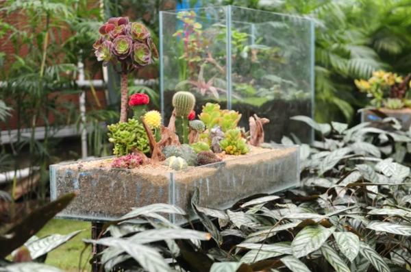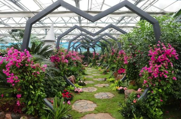 此外,園區(qū)的溫室展館也是展覽的一大亮點。展館主打熱帶主題,主要有蘇鐵展示區(qū)、熱帶水果展示區(qū)、熱帶小屋、熱帶蘭展示區(qū)、生態(tài)微景觀的植物缸及多肉缸展示區(qū)。今年,園區(qū)引進了蘇鐵王、蘇鐵女王、非洲蘇鐵、石山蘇鐵、越南篦齒蘇鐵、臺灣白磷蘇鐵、凱恩蘇鐵、墨西哥鐵等多個種類的鐵樹。其中,篦齒鐵樹形優(yōu)美,蒼勁質(zhì)樸,油綠可愛,是珍貴的觀葉植物,老干布滿歲月痕跡,獨具觀賞價值。展館里所展出的篦齒鐵已有近四五百年的歷史,與綠童、觀光塔造型相融合,三角梅、雞蛋花等多種花卉做點綴,致敬綠博園開園十周年。展館還特設(shè)了熱帶水果展示區(qū),種植了楊桃、芭樂、咖啡、釋迦果、荔枝、芒果等多種熱帶水果,大家來這里觀賞一下平常吃的水果都是什么樣的。