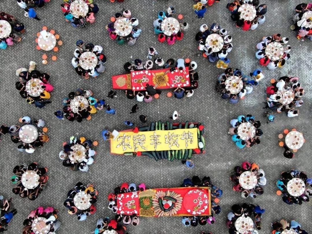 人們邊吃邊談?wù)撘荒曦S收的景象