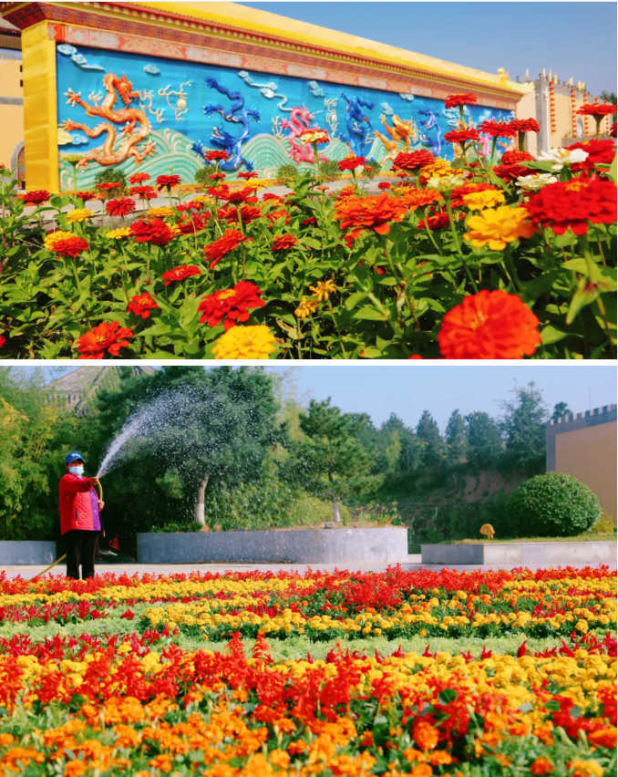走近前廣場(chǎng),濃濃的節(jié)日氛圍映入眼簾,每年景區(qū)都會(huì)換不同的造型來迎接這普天同慶的好日子,這里更是游客拍照的必打卡之地。