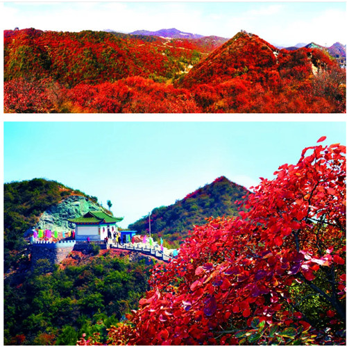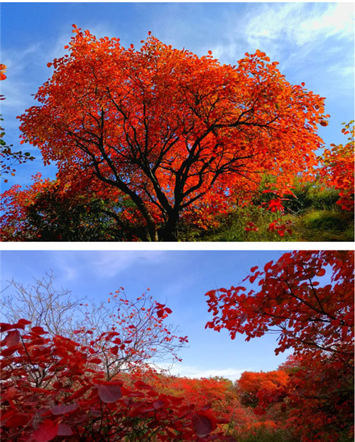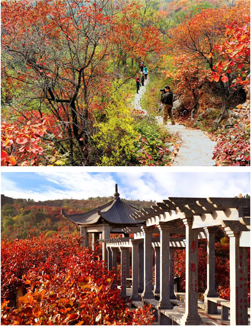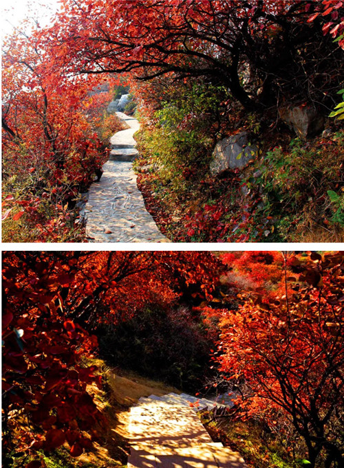 整個(gè)山坡被紅葉覆蓋著,在陽光的照耀下,猶如一團(tuán)團(tuán)的火焰在燃燒。朝霞初照,像落在山腰的紅云彩;晚霞輝映,又像一團(tuán)團(tuán)紅瑪瑙。中國紅,早已成為了秋天長壽山的神韻與底色。