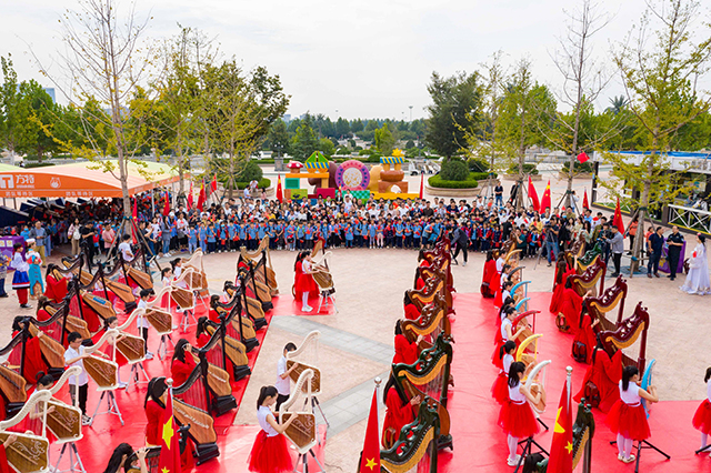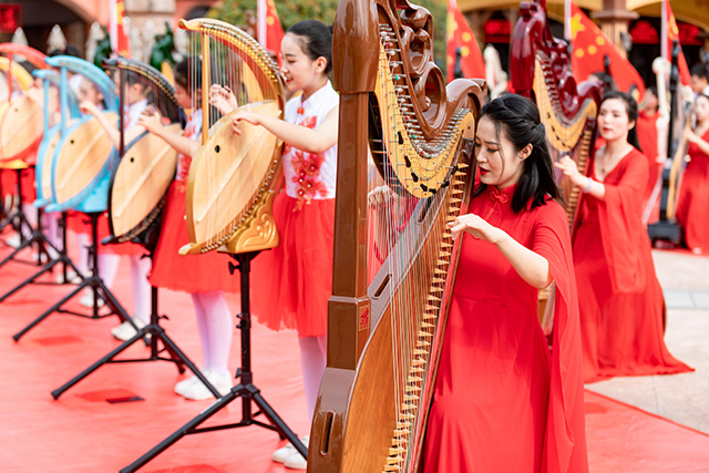 活動(dòng)當(dāng)天,在處處飄揚(yáng)著鮮艷五星紅旗的方特旅游度假區(qū),百名箜篌演員排列成“71”字樣,五十六名身著民族特色服飾的演員環(huán)繞在其周圍。當(dāng)流傳千年的箜篌奏響《我和我的祖國》時(shí),近千名小學(xué)生和游客游客紛紛圍攏過來,共同唱起祖國贊歌。