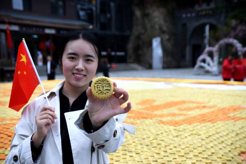 9月30日,中秋國慶雙雙來臨,河南洛陽老君山廣場,工作人員用近萬枚月餅拼成一個直徑達8米的超大月餅,這個特殊的超大月餅上有大家現場制拼出的“我愛你中國”字樣和一輪明月圖案。大家手持小紅旗,圍著月餅,隨著愛國歌曲“我愛你中國”、《我和我的祖國》音樂聲的響起,現場的氣氛也達到了高潮。游客和工作人員高舉小國旗,跟隨著音樂旋律一起舞動、一起歌唱,抒發(fā)著對祖國的熱愛和美好生活的向往。