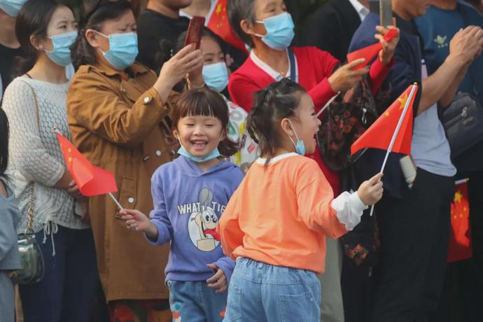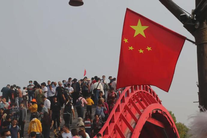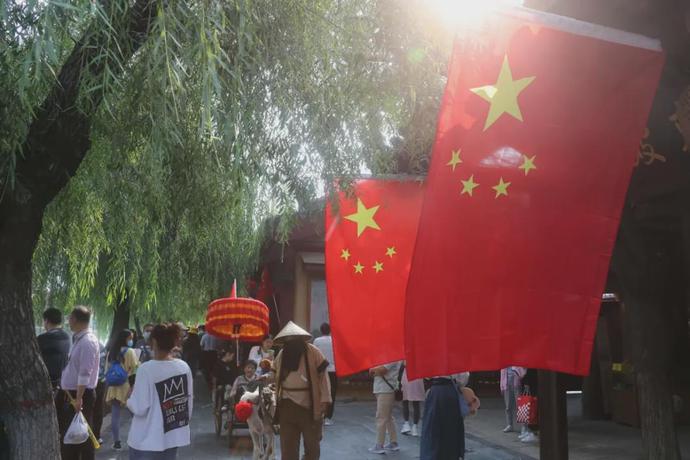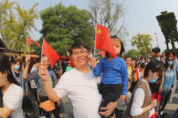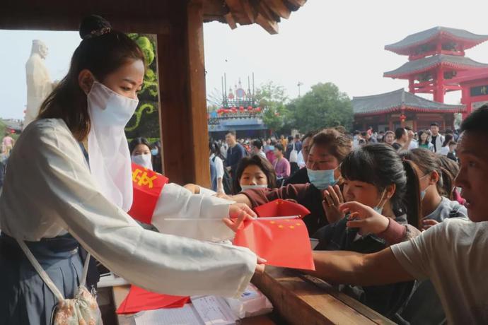 景區(qū)為入園的游客免費(fèi)發(fā)放國旗, 游客揮舞著手中的旗幟與滿園的中國紅互相輝映, 上萬面五星紅旗飄揚(yáng)在景區(qū)各個(gè)角落。