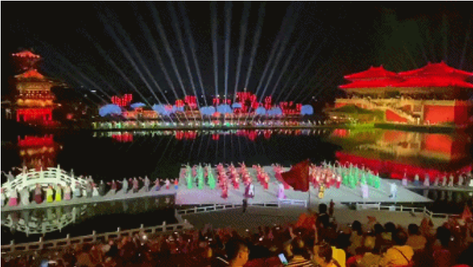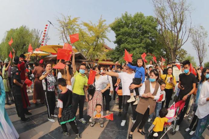 《大宋·東京夢華》演出現(xiàn)場, 所有演員與現(xiàn)場數(shù)千名游客共同揮舞著國旗, 激情唱響《歌唱祖國》, 現(xiàn)場氣氛燃到爆炸!