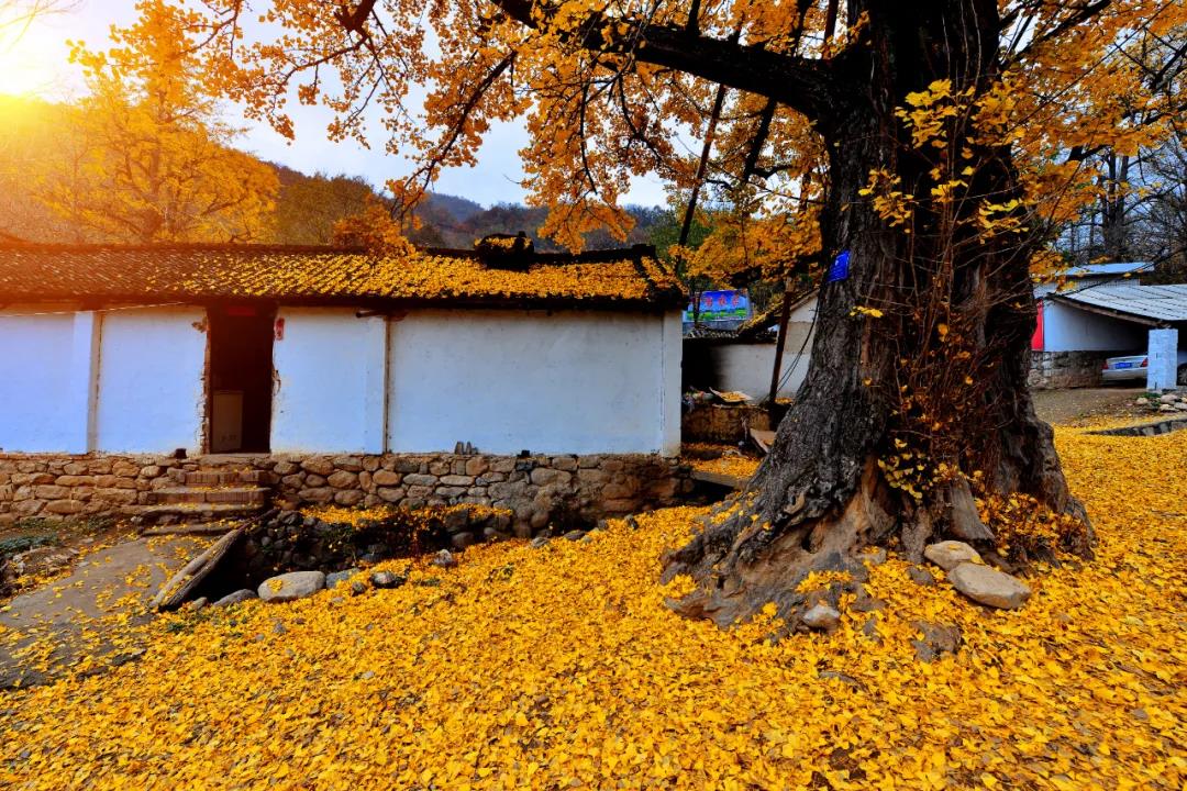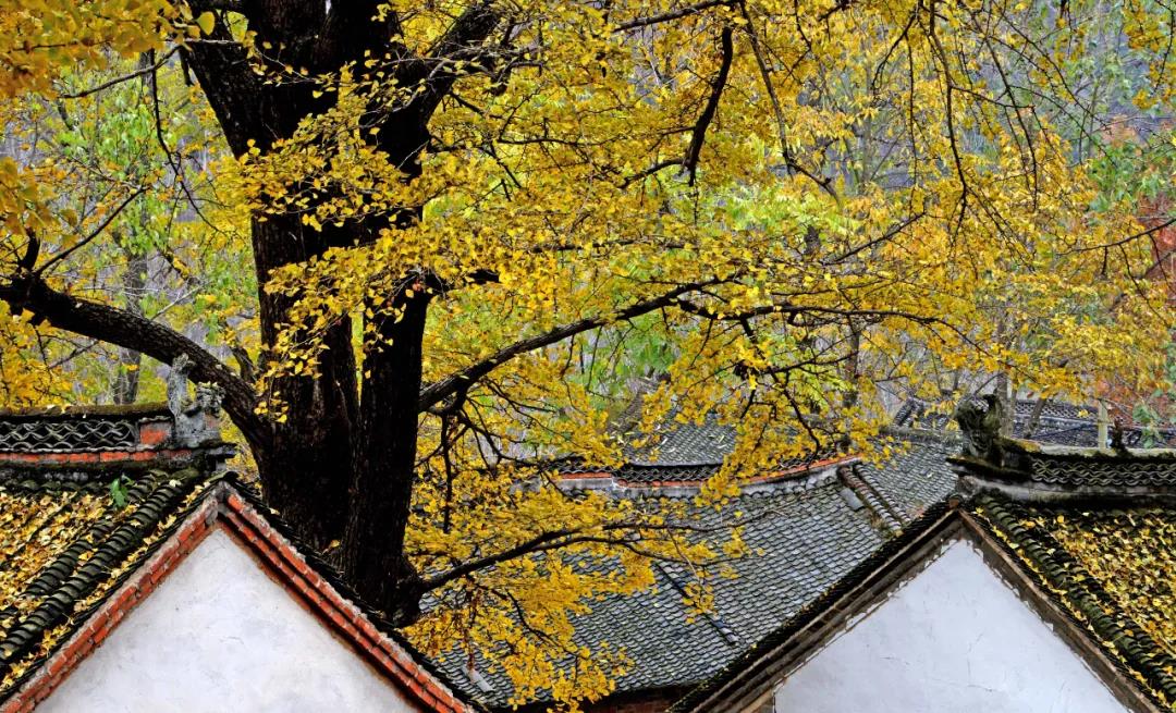 金秋時節(jié),銀杏黃時,小山村漫天黃葉,遍地金色,一幢幢黃泥土墻粼粼灰瓦的老屋,掩映在高飽和度的色彩世界里。