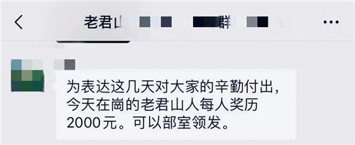 為了慶祝這歷史性的一刻、同時(shí)也為了感謝員工的辛苦付出,景區(qū)領(lǐng)導(dǎo)在微信工作群向全體員工發(fā)話:今天在崗的員工每人直接獎(jiǎng)勵(lì)2000元!