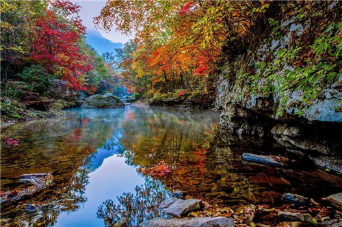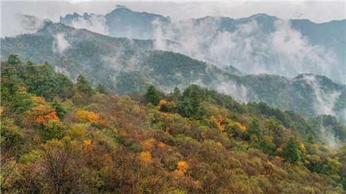 白云山位于伏牛山腹地,最高峰玉皇頂海拔2216米,1300米以上的山峰有103座,森林覆蓋率98.5%,總是能最先感受到季節(jié)的變化。此時(shí)山間已紅葉斑駁,秋意濃濃。云海起伏,將這里幻化成了一個(gè)仙氣飄飄的五彩世界。