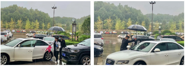 室外下著綿綿小雨,安保人員趕忙為下車的游客撐傘,將游客從車門口護送到室內(nèi),現(xiàn)場的游客們紛紛點贊!