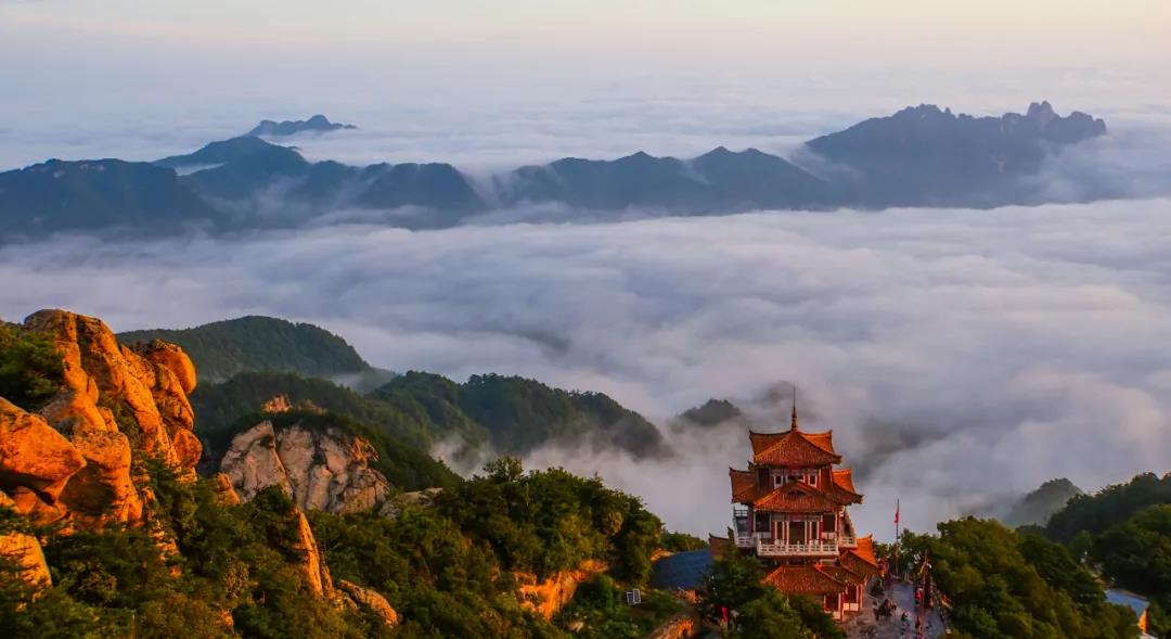玉皇頂海拔2216米,因峰插天宮、頂如皇冠而得名。站在這里極目遠(yuǎn)眺,綿綿青山,青峰千疊,莽莽蒼蒼,形成了一幅自然生態(tài)潑墨山水畫(huà)。晴空萬(wàn)里時(shí)看重山綿延天際,萬(wàn)峰匯聚足下;云海翻騰時(shí)眼空瑤海一萬(wàn)里,仿佛身在蓬萊仙閣,登高望遠(yuǎn),總是能激起人的蒼茫雄壯之心,忘卻世事擾擾紛紛。日出之時(shí),滿(mǎn)天的彩霞,殷紅的朝陽(yáng),絢麗的群峰,金色的萬(wàn)木,構(gòu)成了一幅壯麗的畫(huà)卷,令人嘆為觀止!