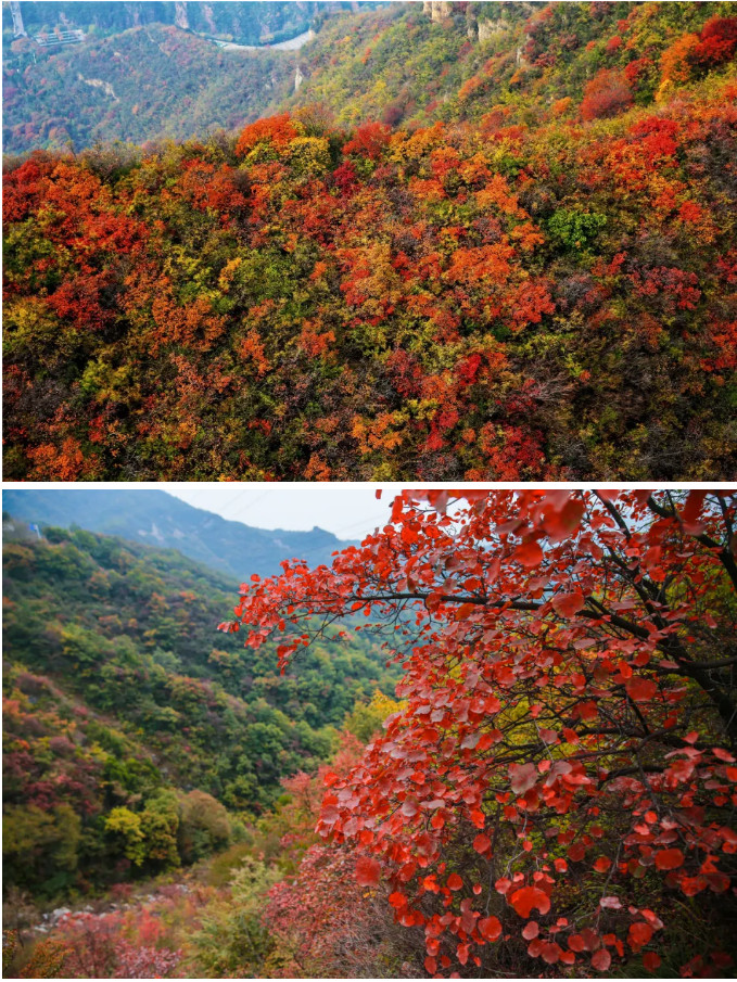 陣陣秋風妙如筆,片片綠葉染紅霜。進入十月中旬的云臺山,整個山巒像是被顏料潑染,紅火熱烈,如霞似錦,惹人陶醉。