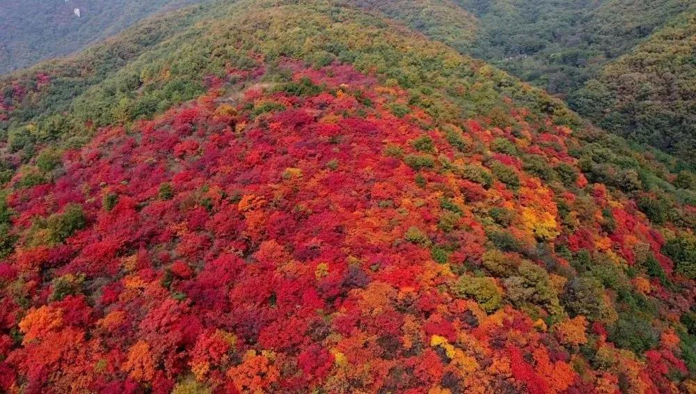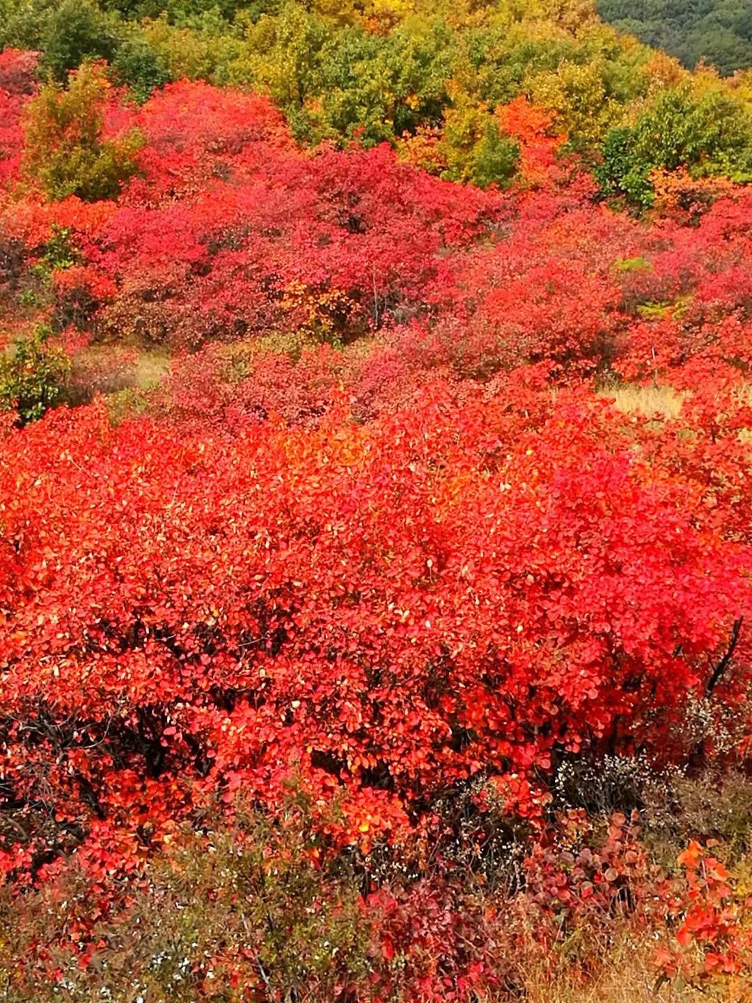 到達山頂后,往下望去,層林盡染,一片紅色的海洋,宛若一條條靈動的絲帶綿延開來,亦或是一片片飄逸的彩霞,在山間縈繞。