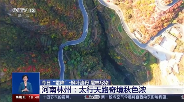 10月23日18:39,CCTV13——央視新聞頻道《共同關(guān)注》欄目將鏡頭對準(zhǔn)了太行大峽谷,與全國觀眾一起分享這里如畫的秋色!