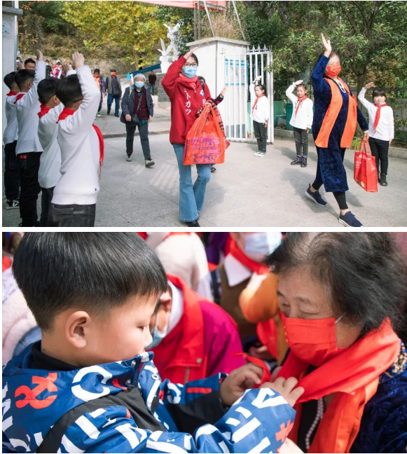 數(shù)百件學習用品,從爺爺奶奶們的手中傳遞到卡房村小學的學生手上。孩子們臉上洋溢著開心的笑容,他們也為遠道而來的爺爺奶奶們帶上紅領(lǐng)巾,表達了自己的敬意。