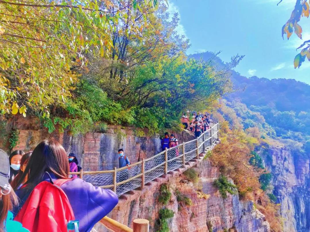 更讓人驚嘆不止的是修建在紅巖絕壁間的玻璃棧道,環(huán)繞山峰。這條玻璃棧道,游客們可以一邊攀登高峰,一邊從不同角度欣賞新鄉(xiāng)南太行的景觀。