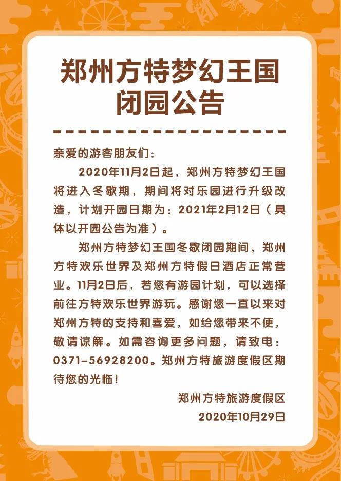 10月29日,鄭州方特方特旅游度假區(qū)發(fā)布公告稱,11月2日起,鄭州方特夢幻王國將進(jìn)入冬歇期,期間將對(duì)樂園進(jìn)行升級(jí)改造,計(jì)劃開園日期為:2021年2月12日(具體以開園公告為準(zhǔn))。