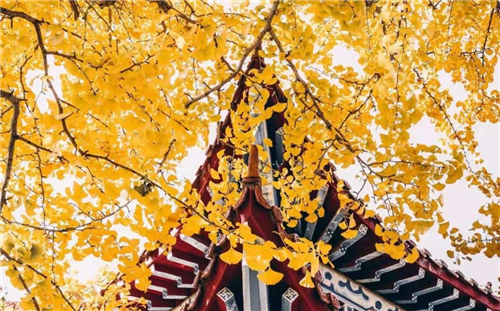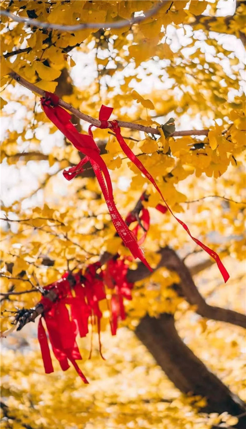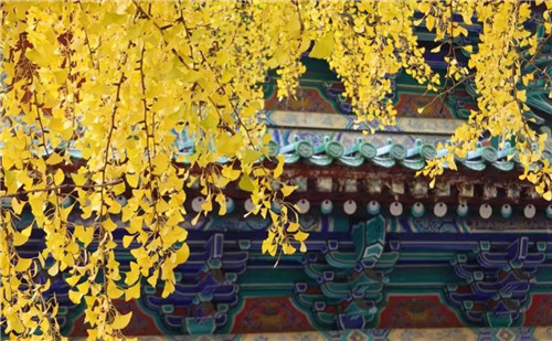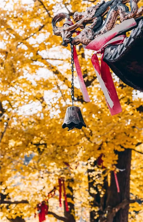 紅墻、青瓦、黃金葉,古剎、風(fēng)來、鐘聲起。陽光灑滿枝頭,透過扇葉,普照金色古剎,神圣而美好。