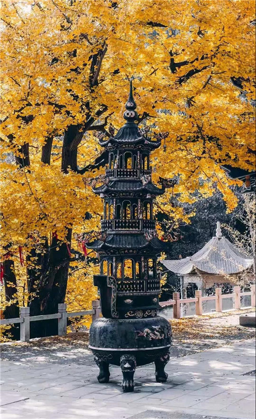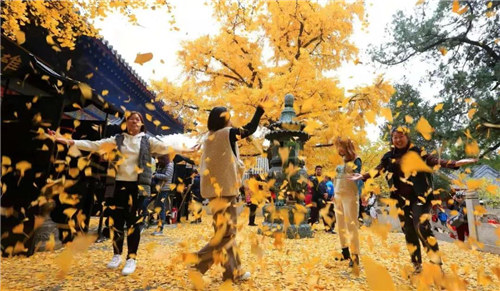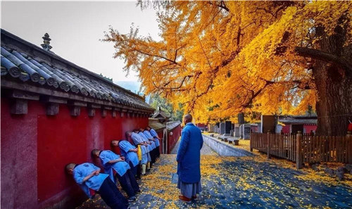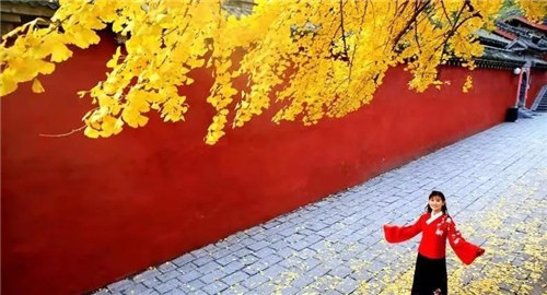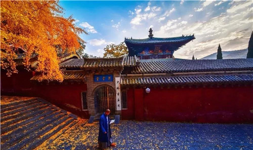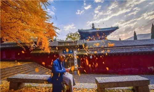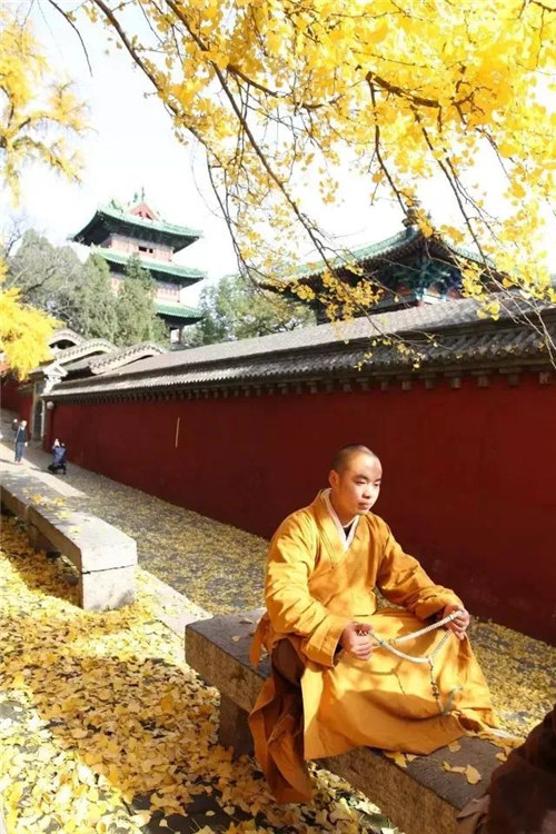 隨風(fēng)飛舞的扇形銀杏葉如金色蝴蝶,零落飄散在少林寺內(nèi)的甬道和蓮階之上,與素衣僧人、古樸的寺廟建筑相得益彰,令禪宗祖庭少林寺禪意愈濃。