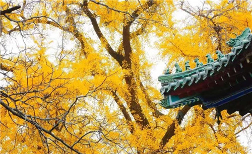“銀杏樹下遍地金”,隨風(fēng)而落的銀杏葉與古樸的寺廟建筑相得益彰。